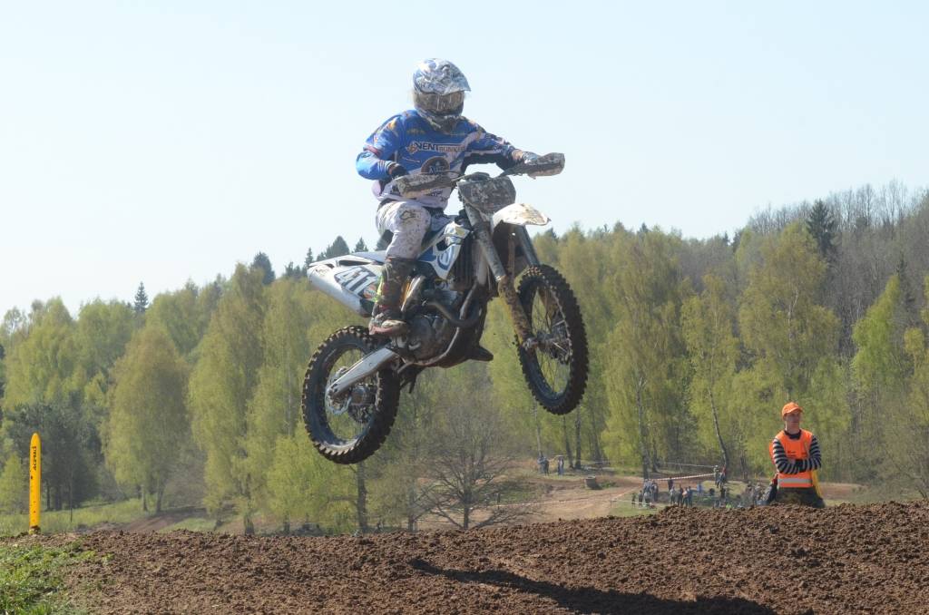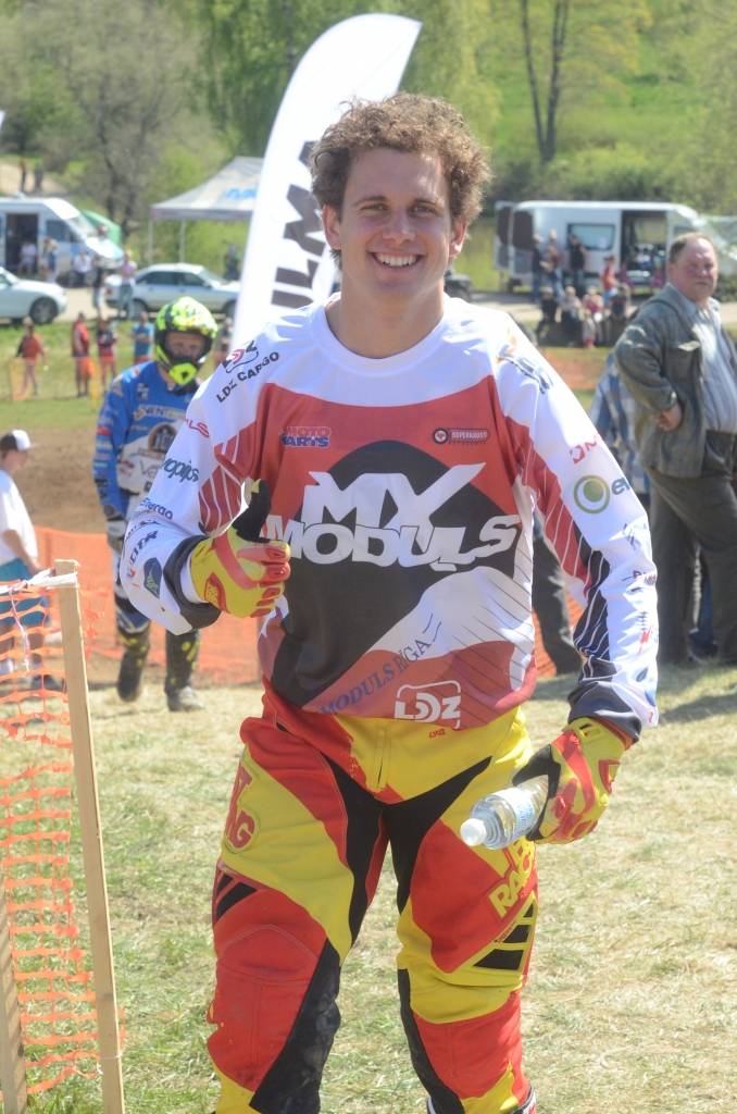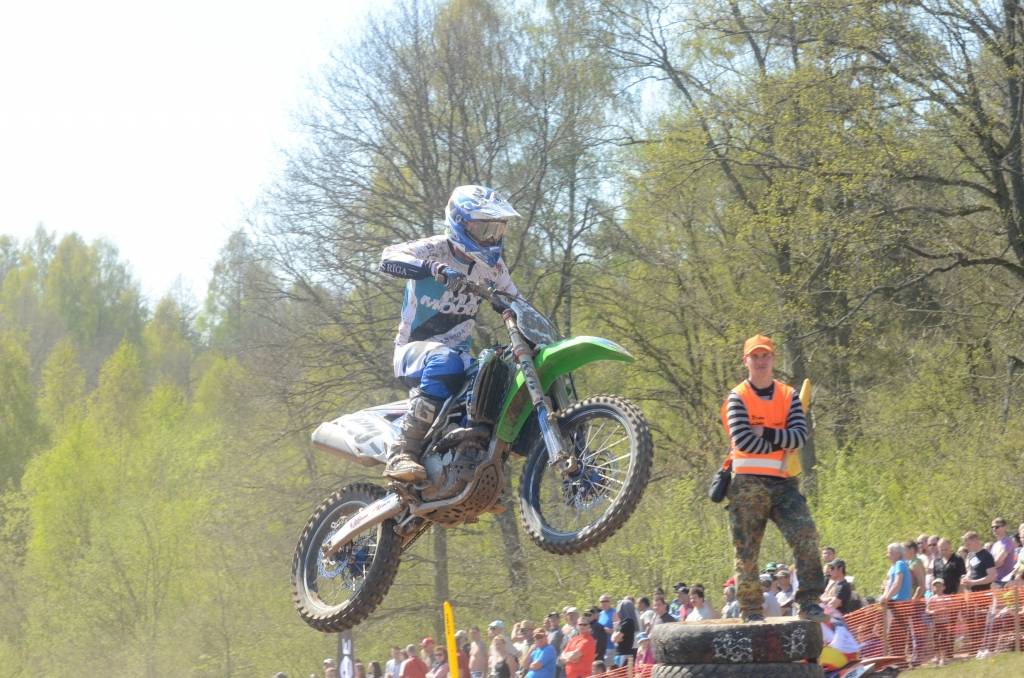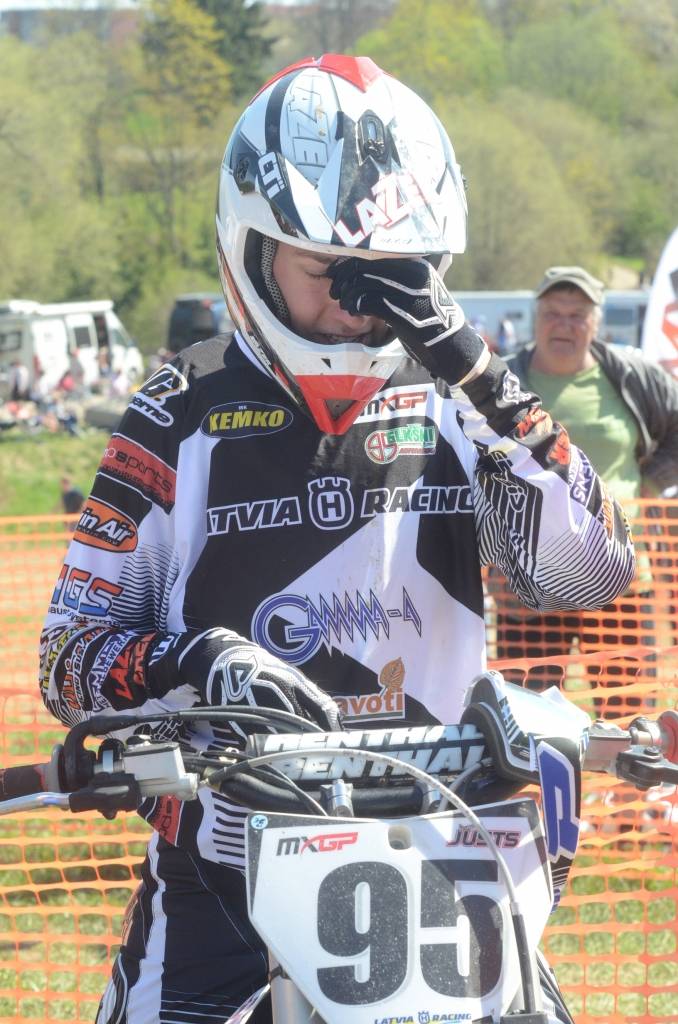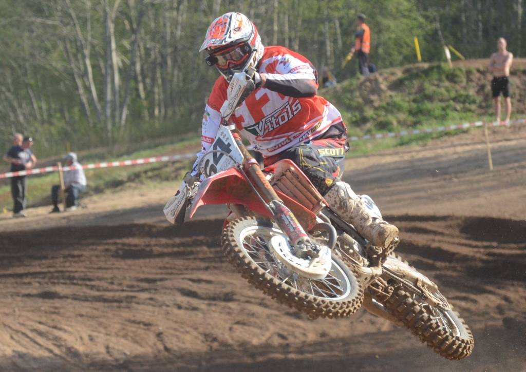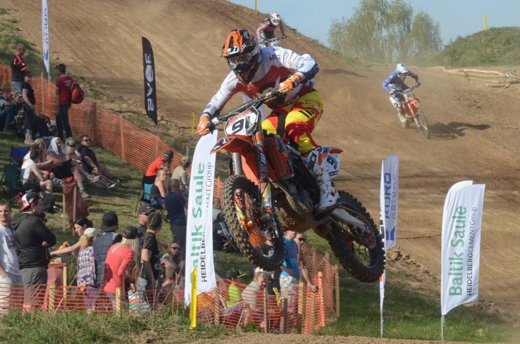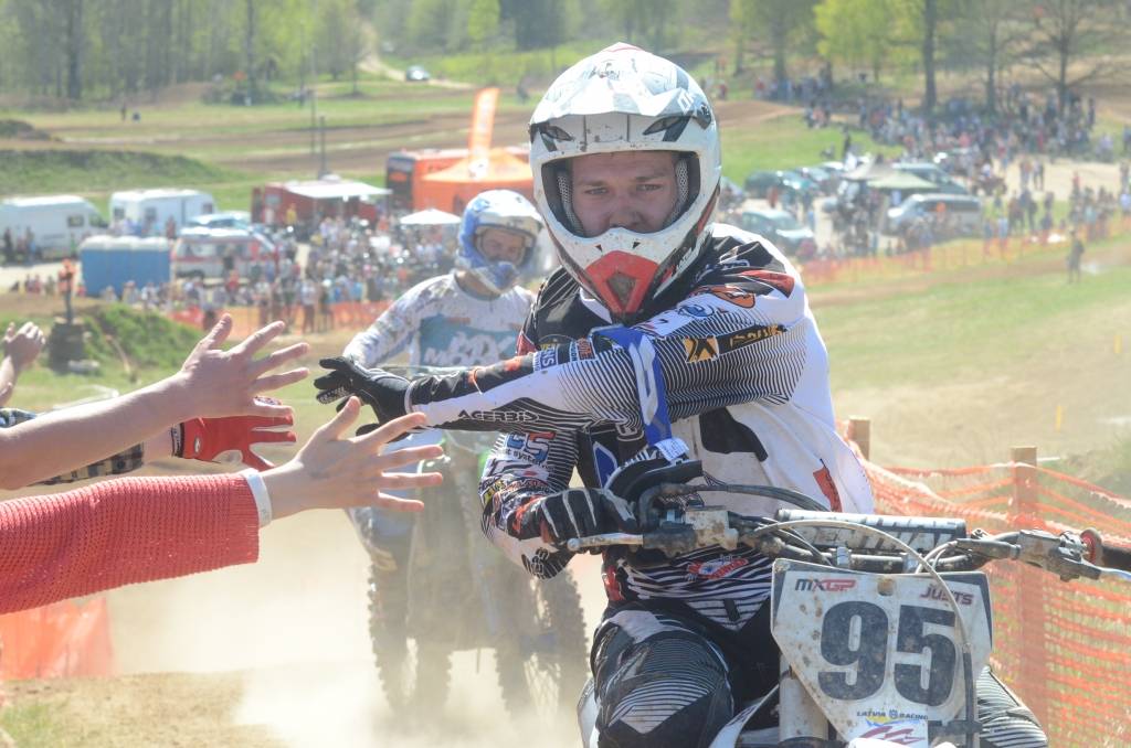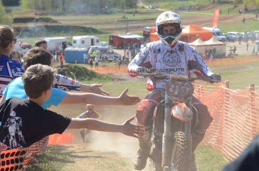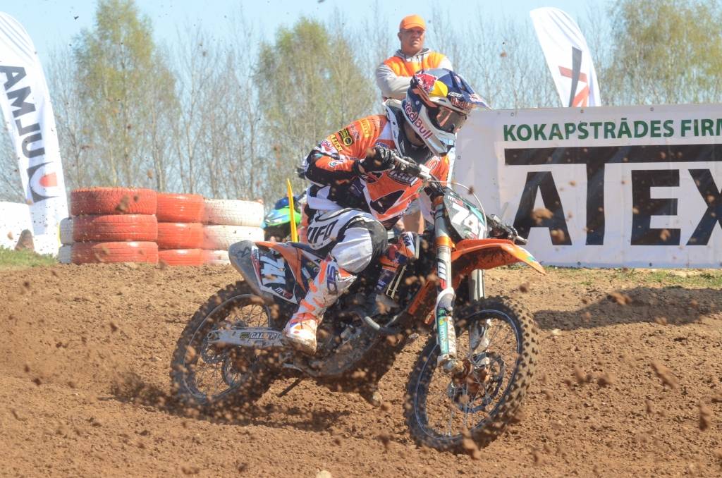PAPILDINĀTS AR BILDĒM. Svētdien, 27. aprīlī, Misiņkalna mototrasē Aizputē ar Matīsa Karro pārliecinošu uzvaru noslēdzās Latvijas čempionāta motokrosā pirmais posms “MX1” klasē. Skatītājiem par lielu prieku “MX2” klasē otrajā braucienā pārliecinošu uzvaru izcīnīja kalvenieks Pauls Jonass.