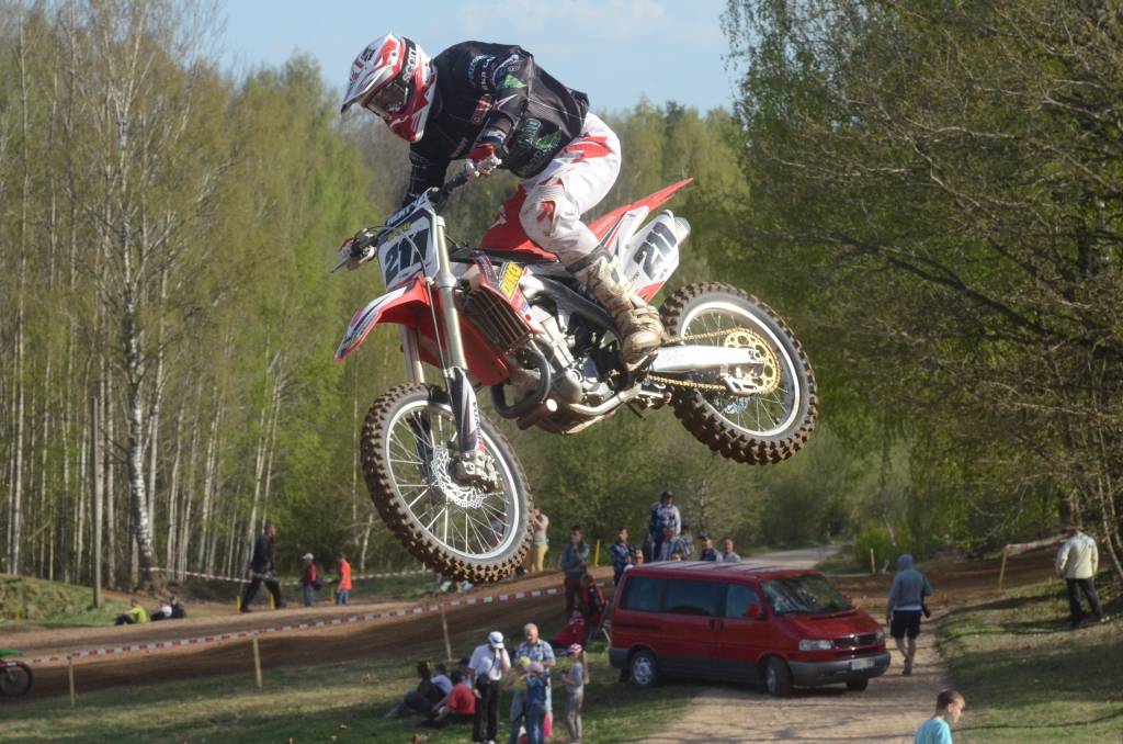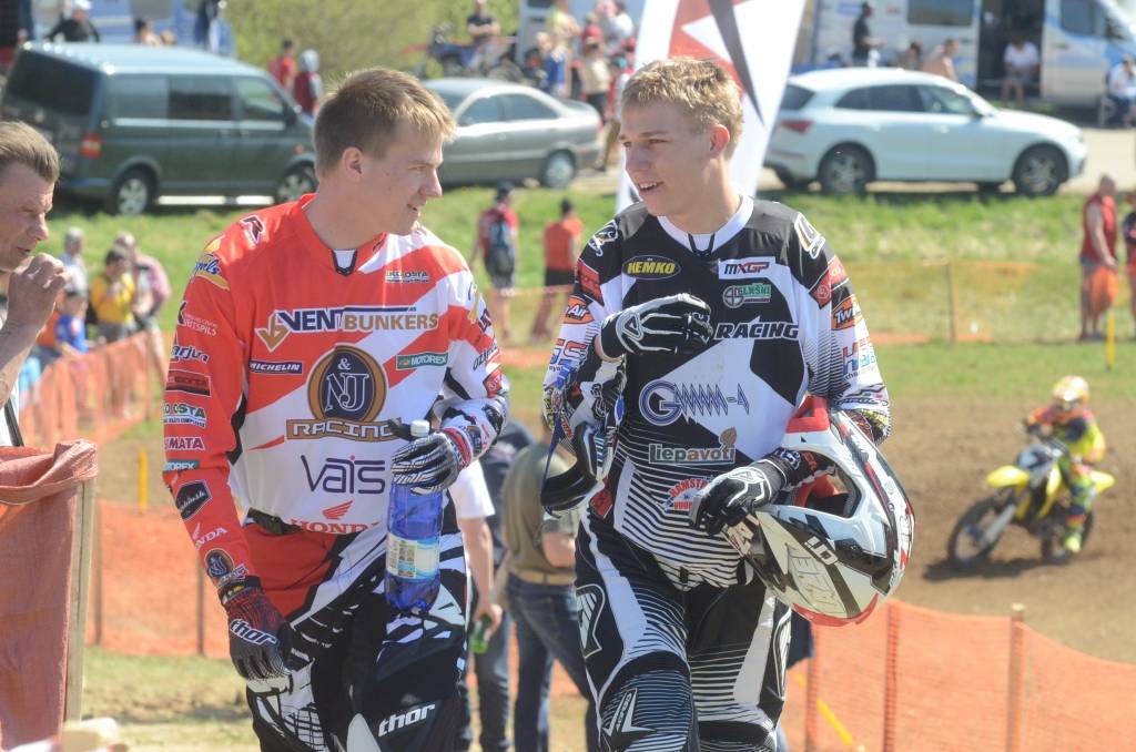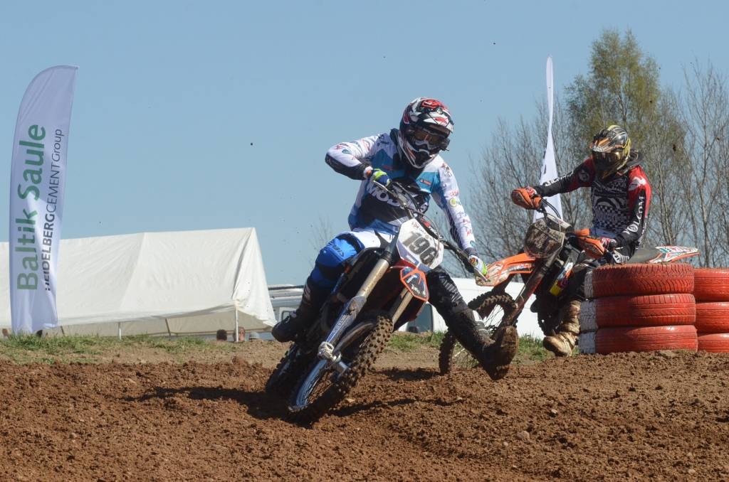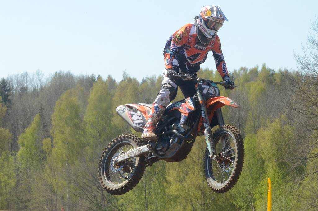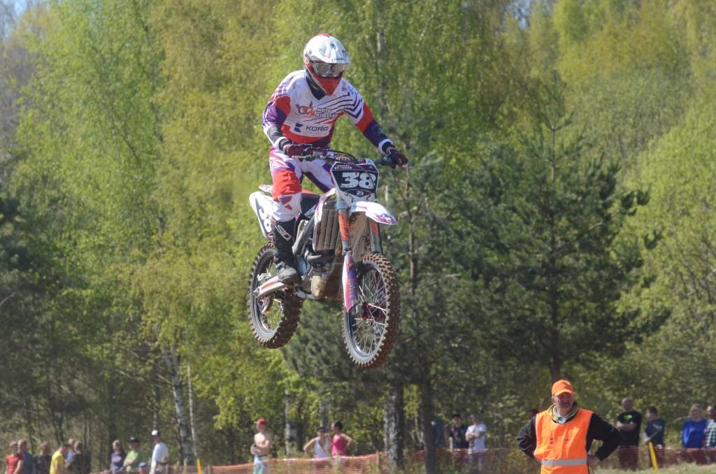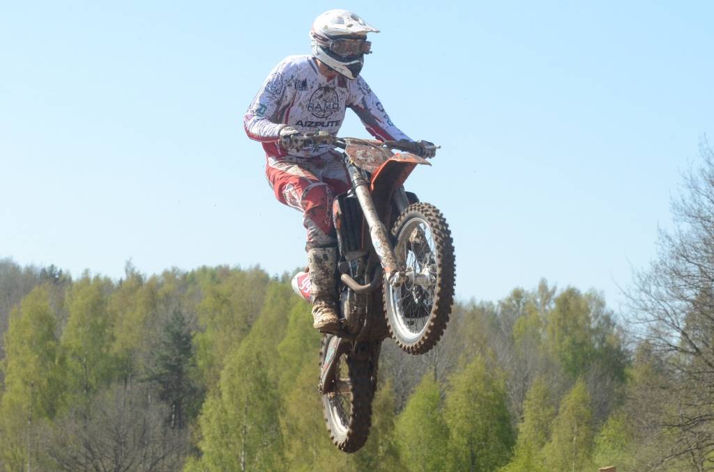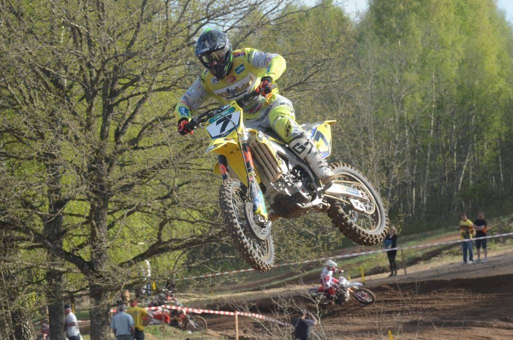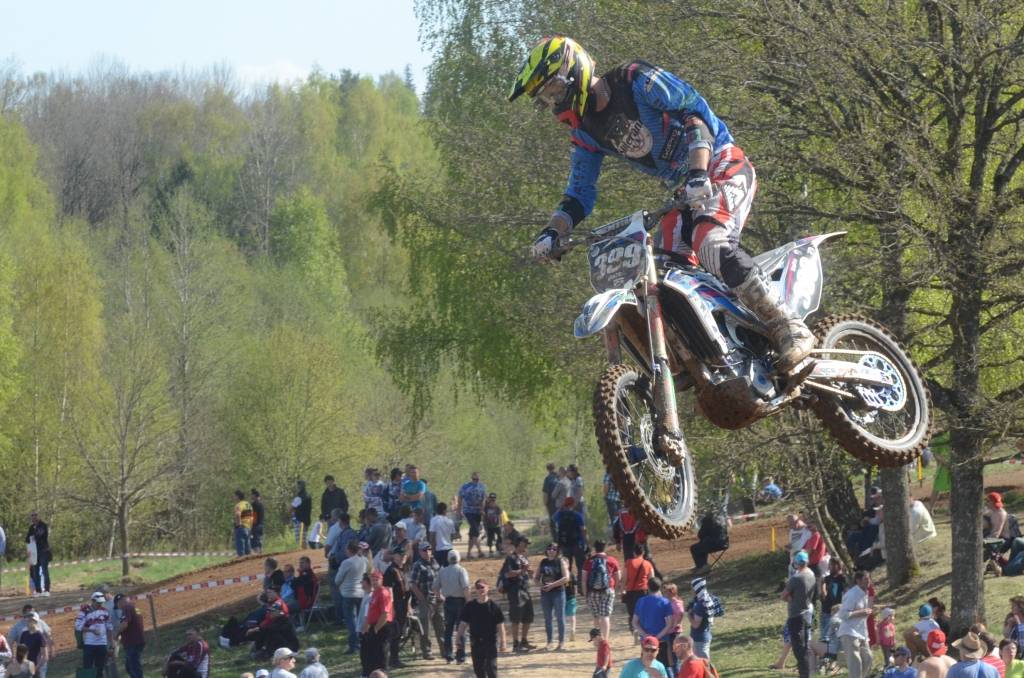 PAPILDINĀTS AR BILDĒM. Svētdien, 27. aprīlī, Misiņkalna mototrasē Aizputē ar Matīsa Karro pārliecinošu uzvaru noslēdzās Latvijas čempionāta motokrosā pirmais posms “MX1” klasē. Skatītājiem par lielu prieku “MX2” klasē otrajā braucienā pārliecinošu uzvaru izcīnīja kalvenieks Pauls Jonass.