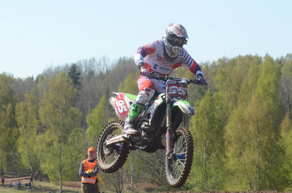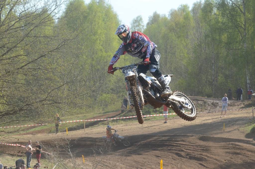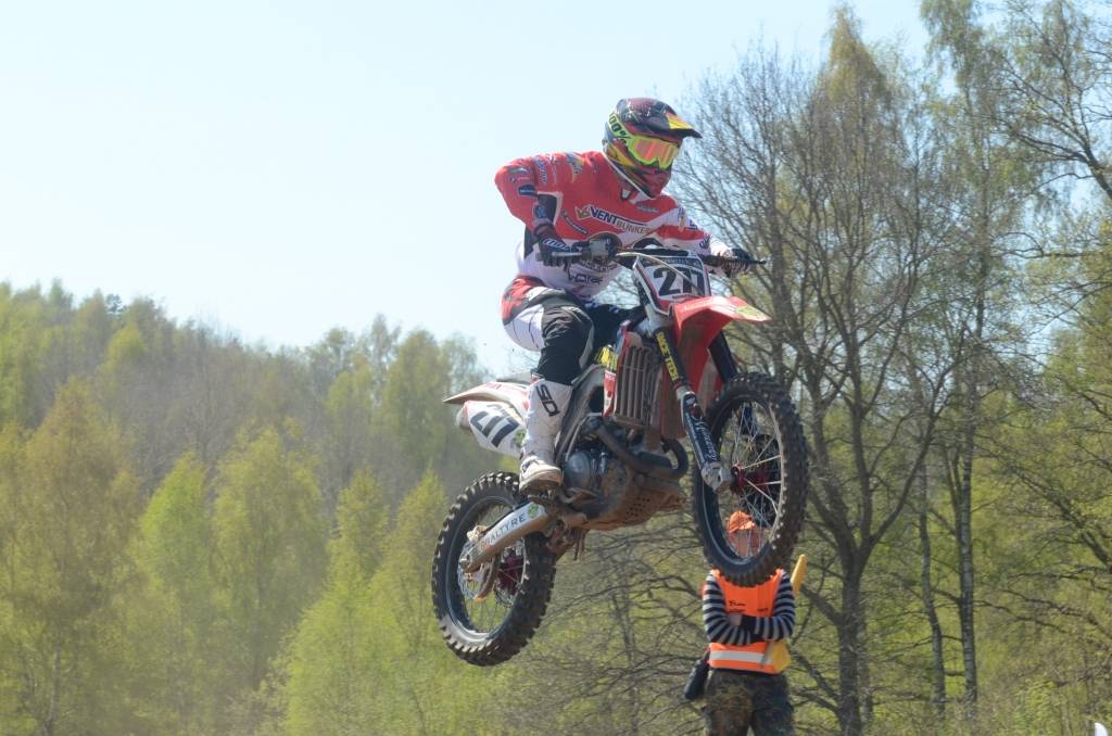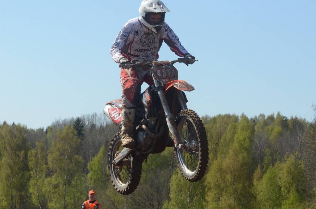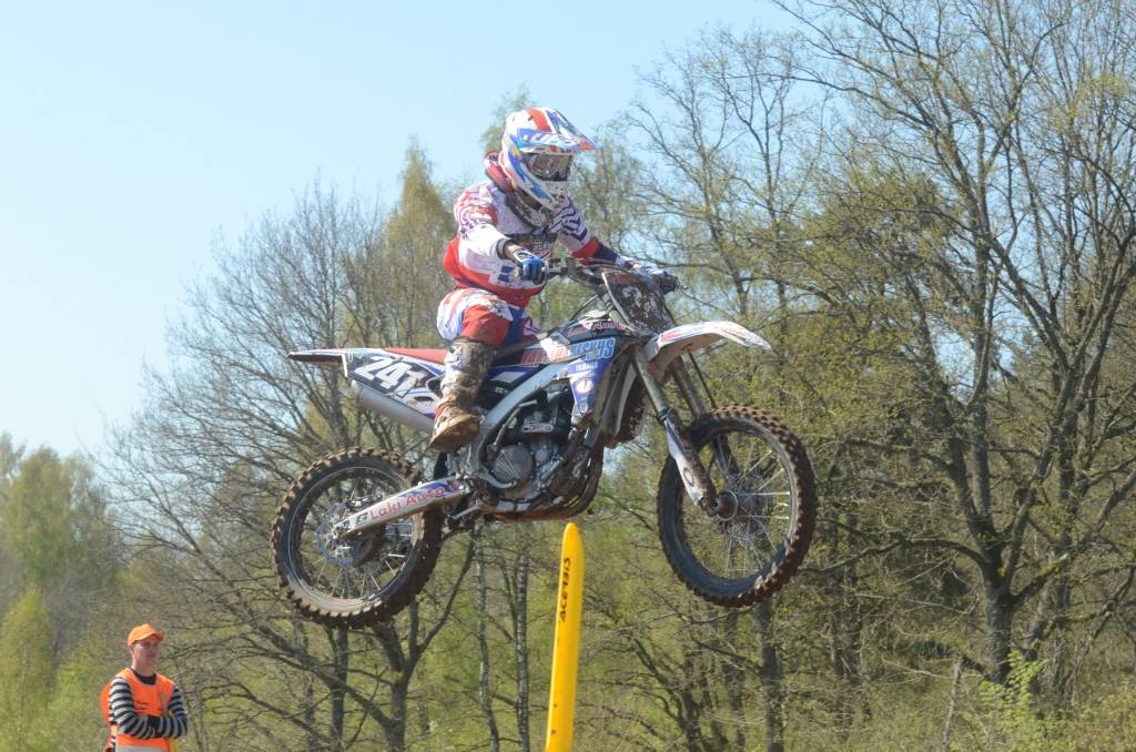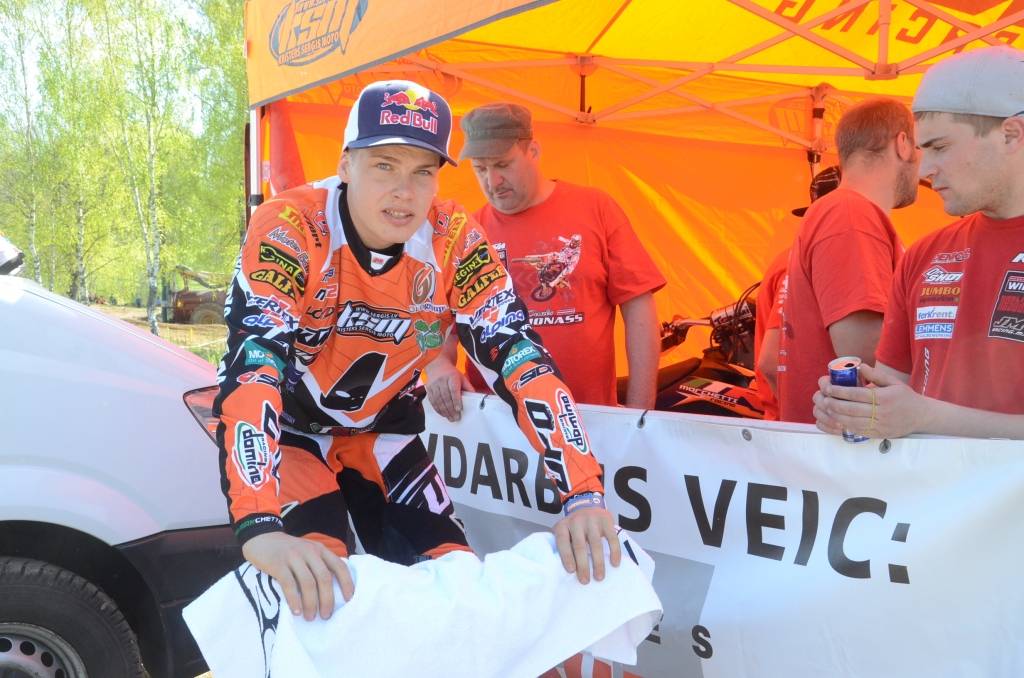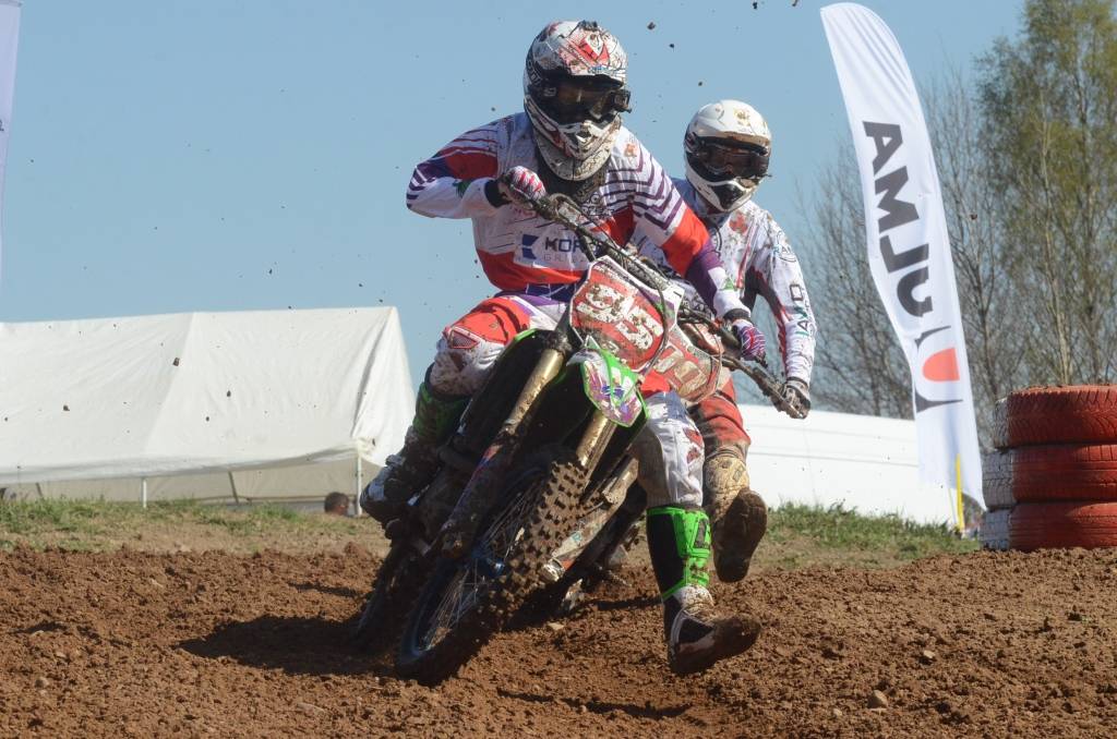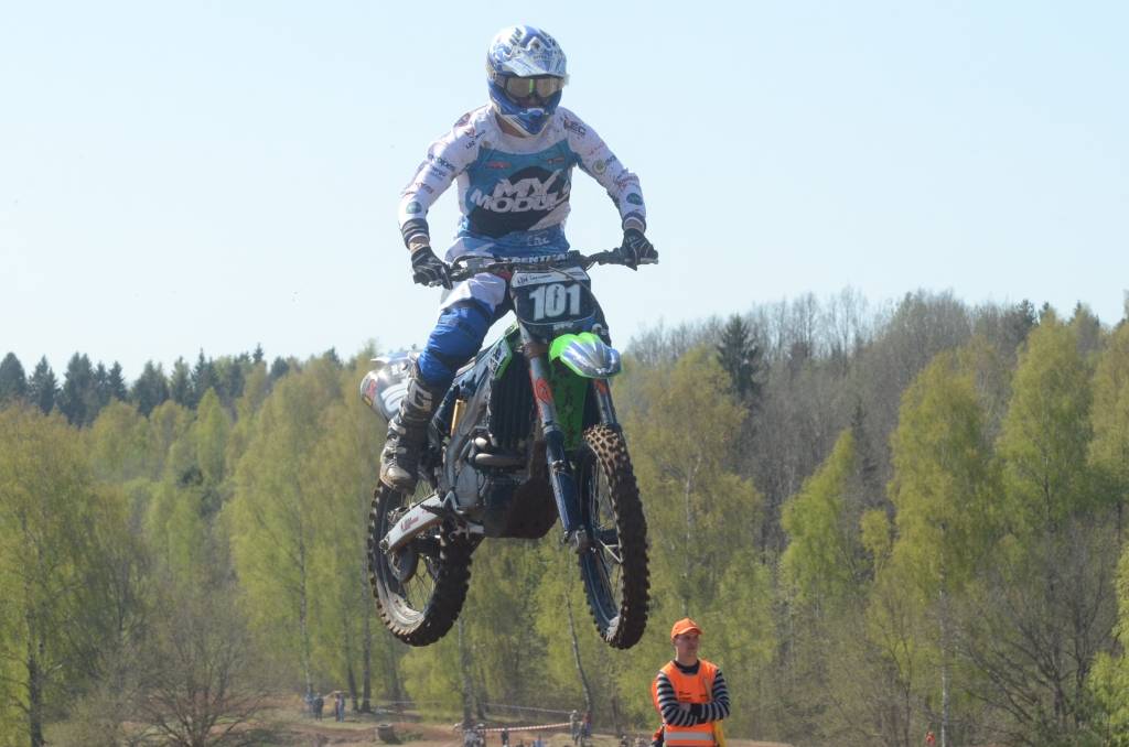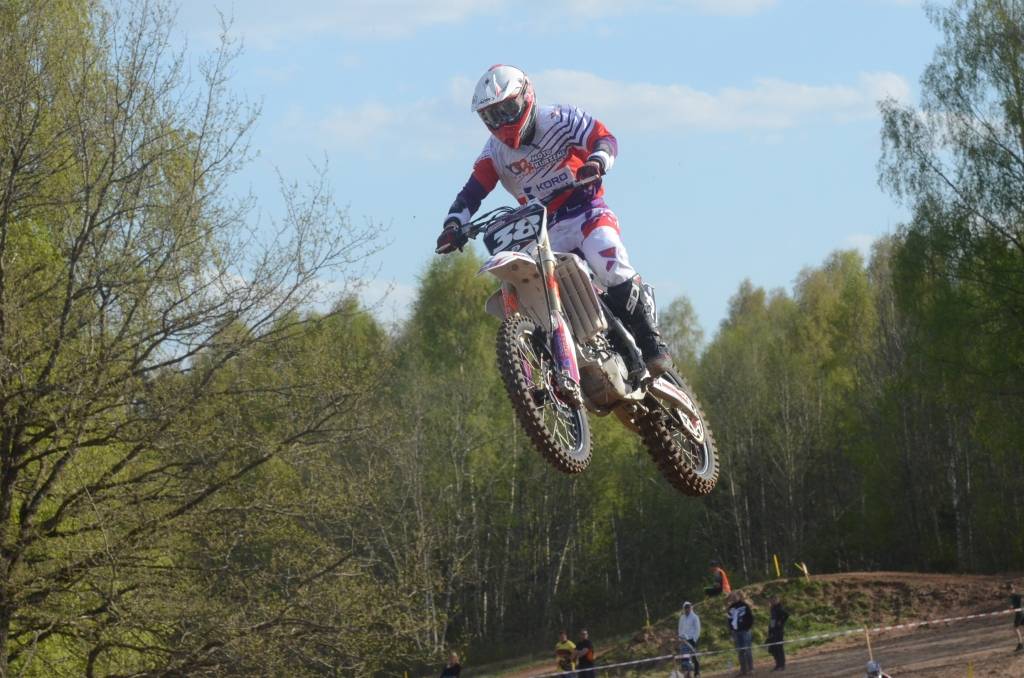 PAPILDINĀTS AR BILDĒM. Svētdien, 27. aprīlī, Misiņkalna mototrasē Aizputē ar Matīsa Karro pārliecinošu uzvaru noslēdzās Latvijas čempionāta motokrosā pirmais posms “MX1” klasē. Skatītājiem par lielu prieku “MX2” klasē otrajā braucienā pārliecinošu uzvaru izcīnīja kalvenieks Pauls Jonass.