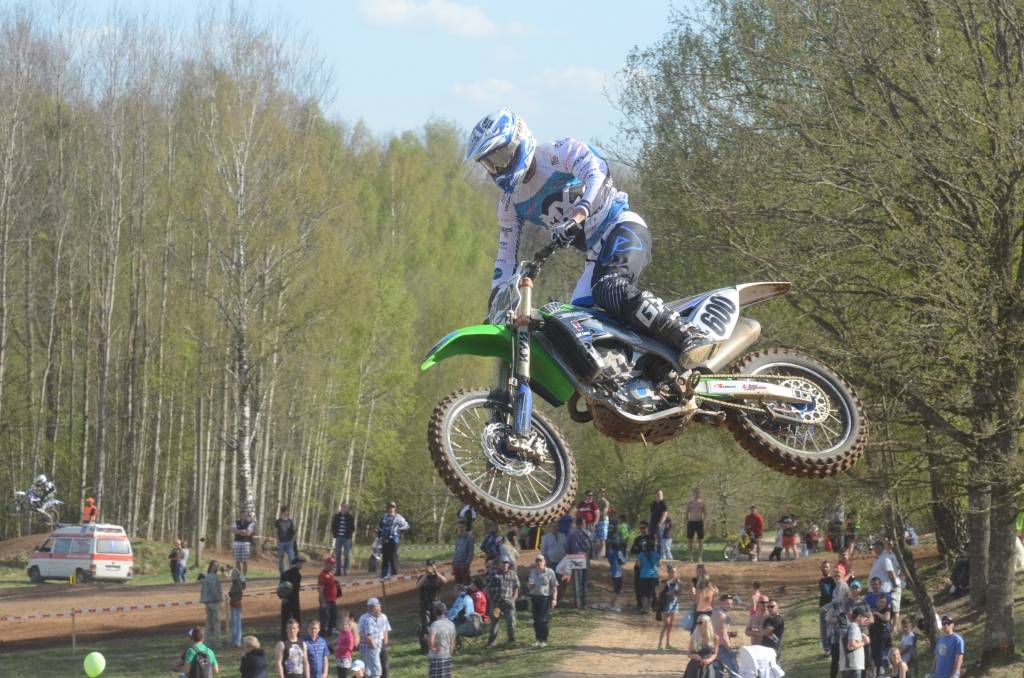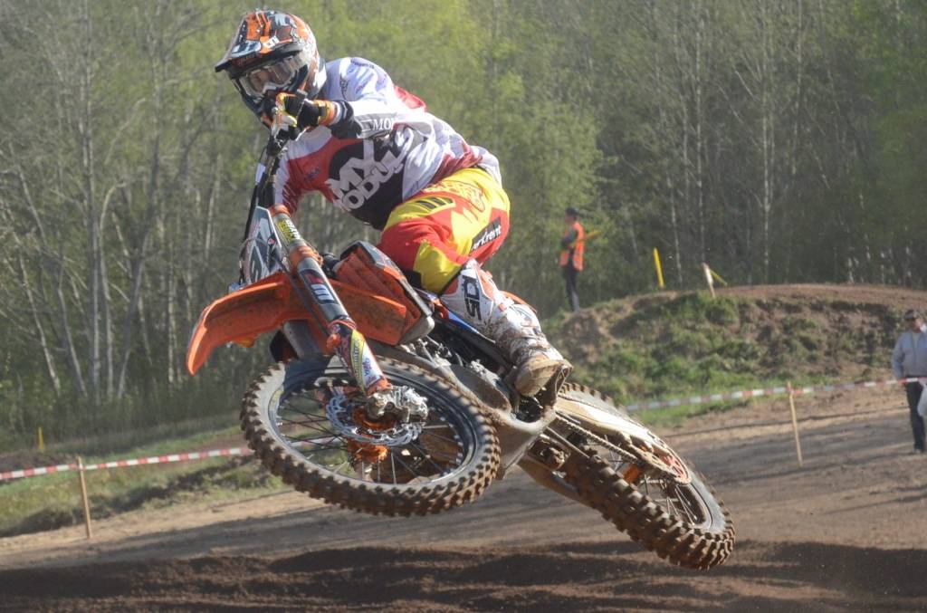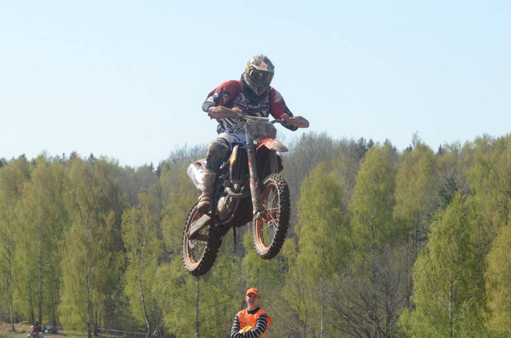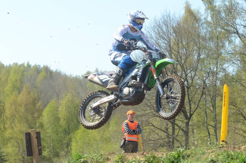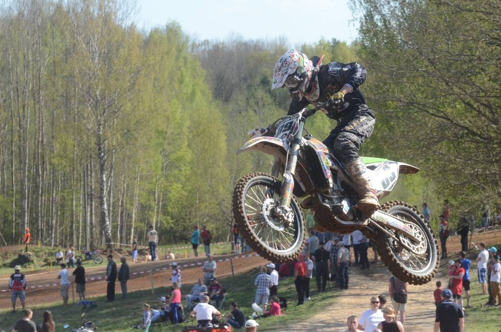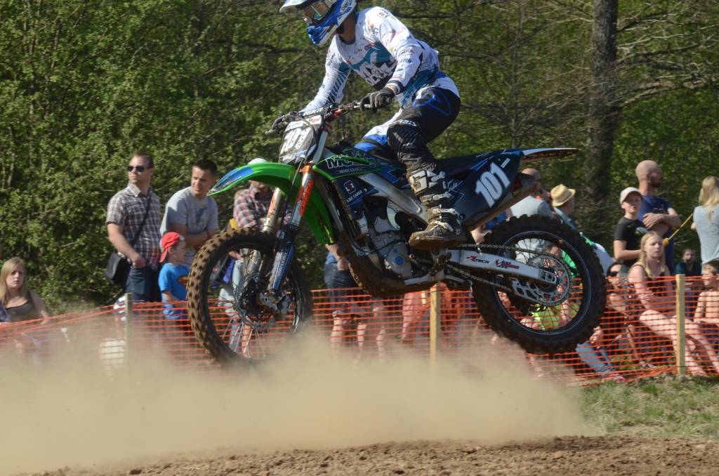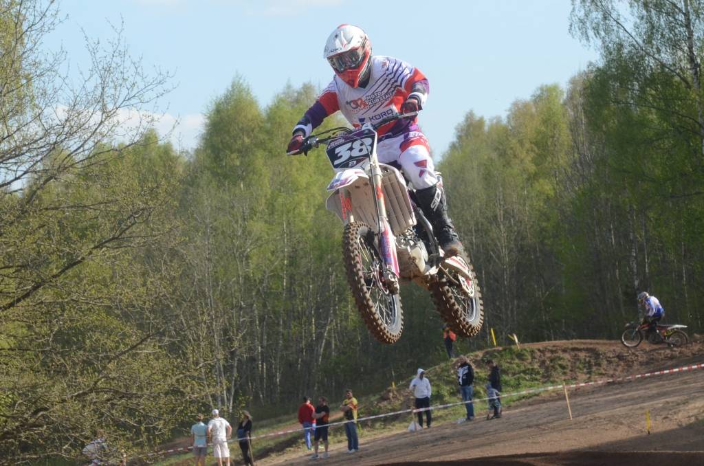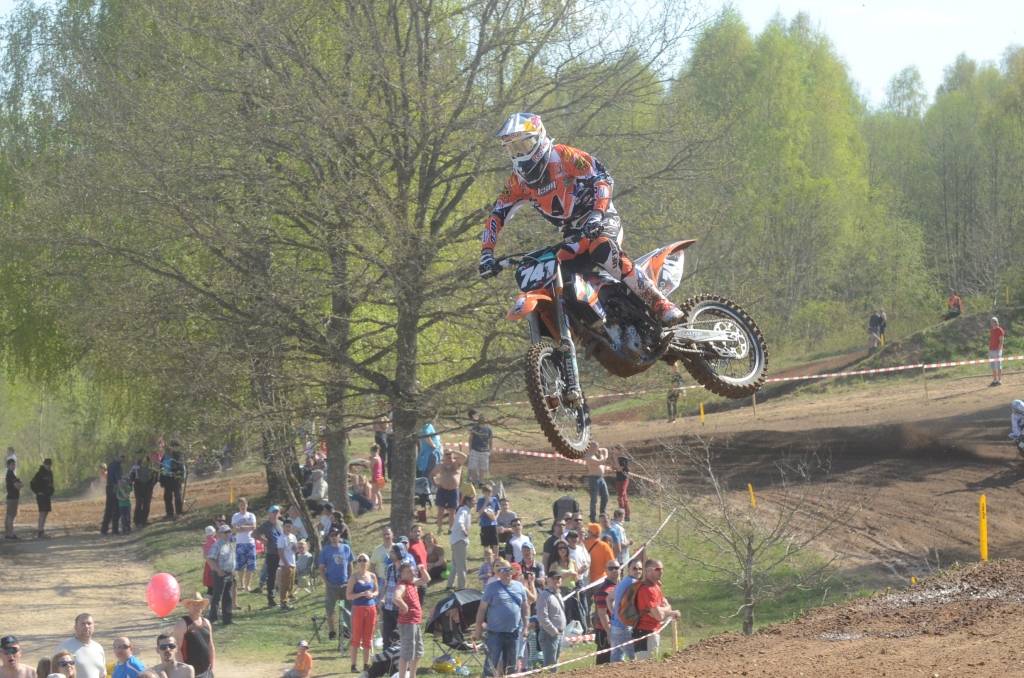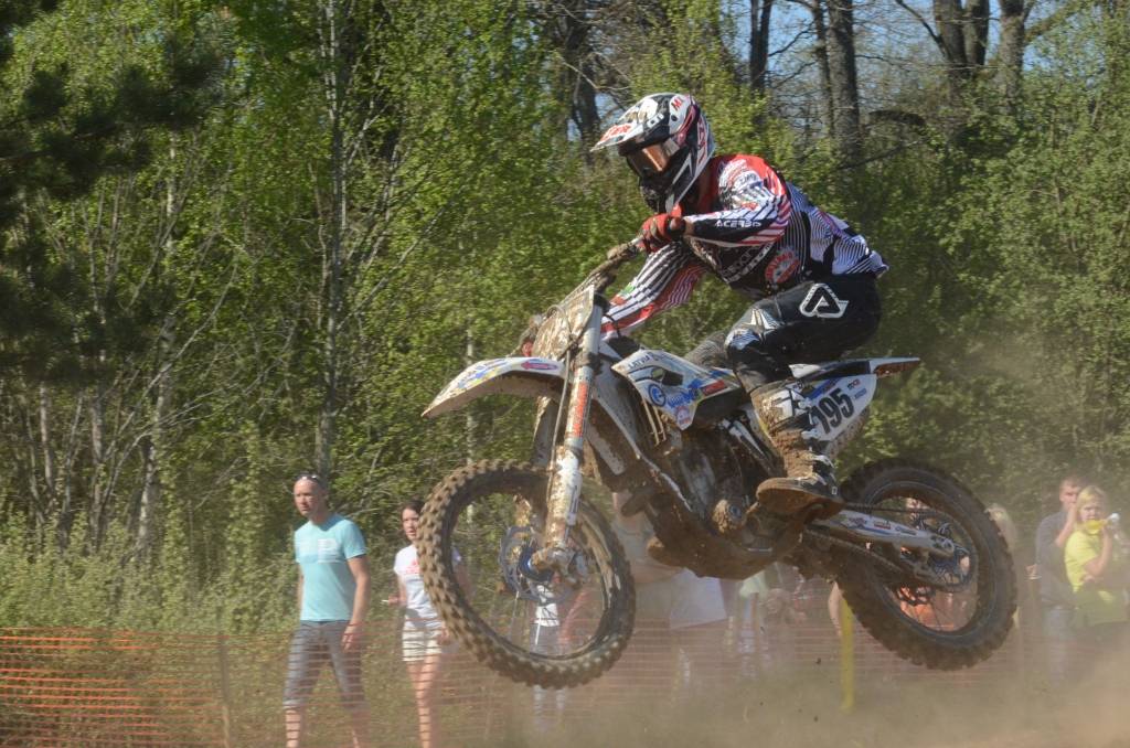 PAPILDINĀTS AR BILDĒM. Svētdien, 27. aprīlī, Misiņkalna mototrasē Aizputē ar Matīsa Karro pārliecinošu uzvaru noslēdzās Latvijas čempionāta motokrosā pirmais posms “MX1” klasē. Skatītājiem par lielu prieku “MX2” klasē otrajā braucienā pārliecinošu uzvaru izcīnīja kalvenieks Pauls Jonass.