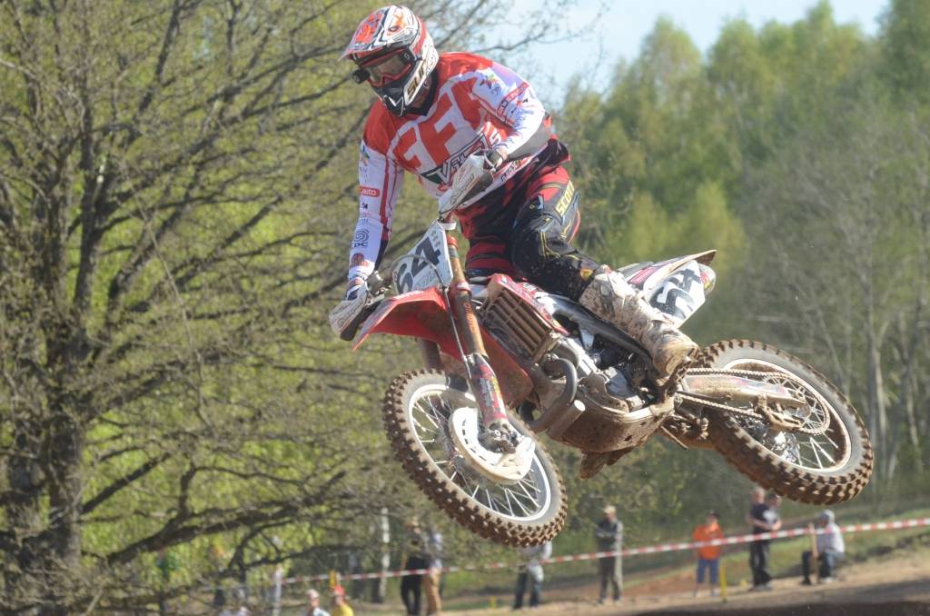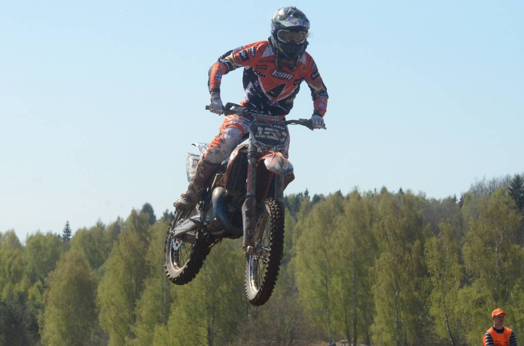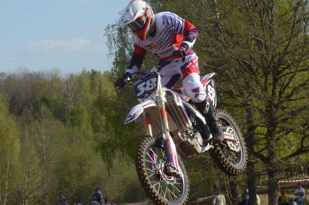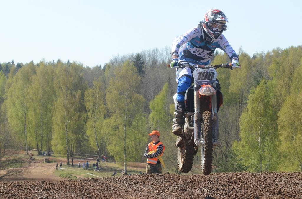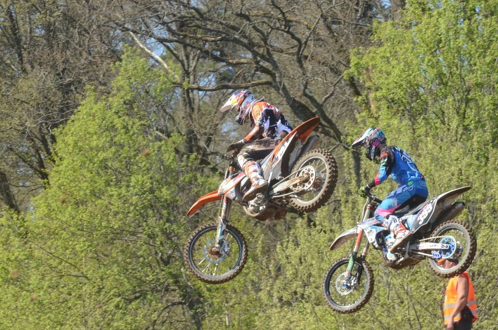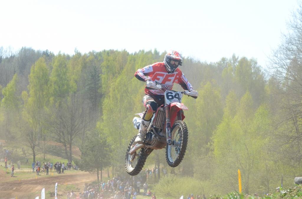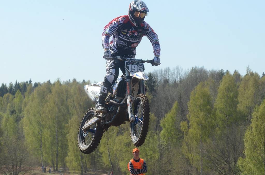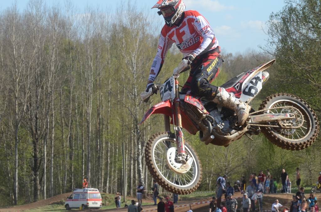 PAPILDINĀTS AR BILDĒM. Svētdien, 27. aprīlī, Misiņkalna mototrasē Aizputē ar Matīsa Karro pārliecinošu uzvaru noslēdzās Latvijas čempionāta motokrosā pirmais posms “MX1” klasē. Skatītājiem par lielu prieku “MX2” klasē otrajā braucienā pārliecinošu uzvaru izcīnīja kalvenieks Pauls Jonass.