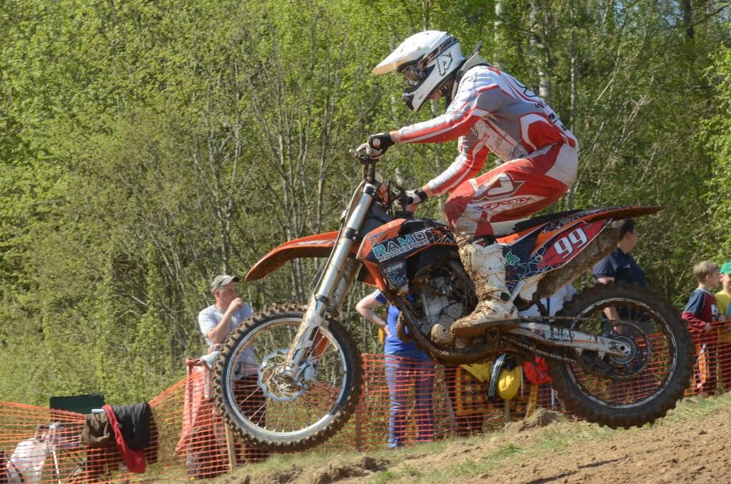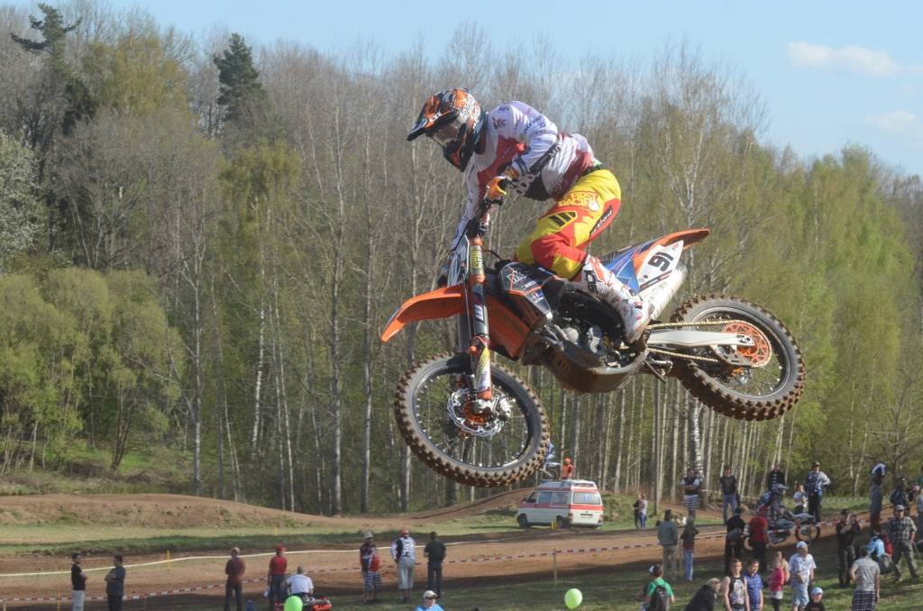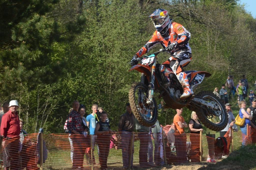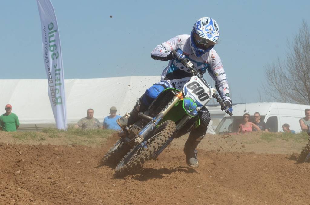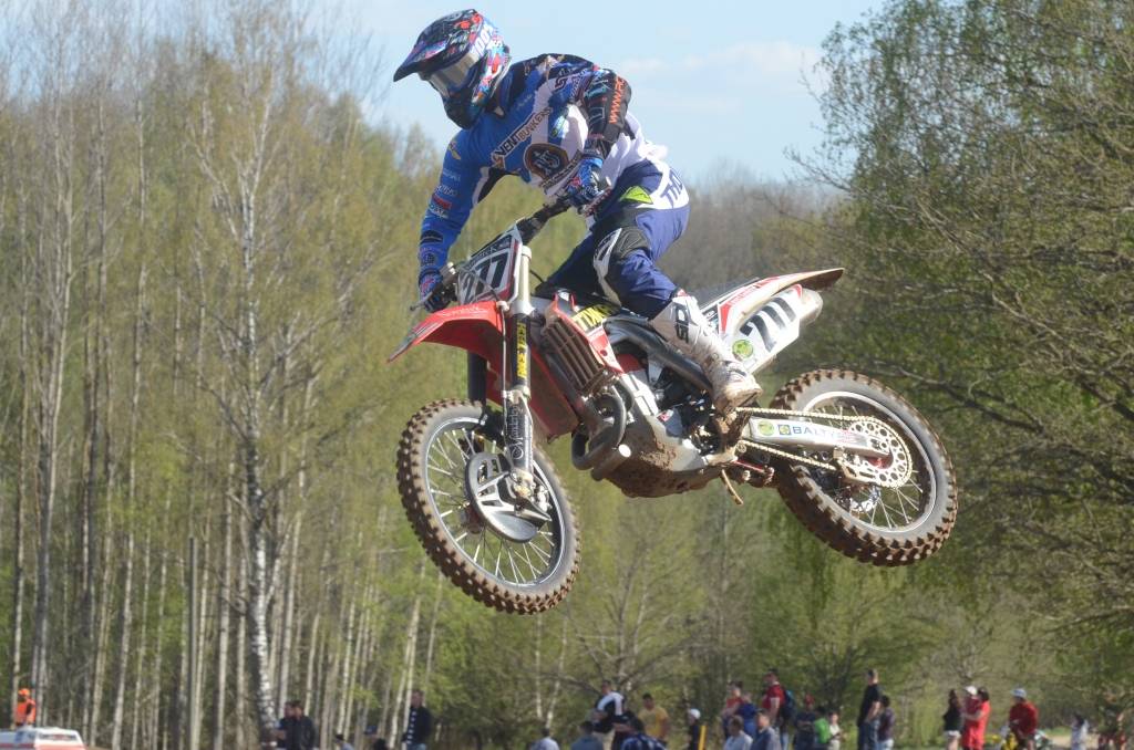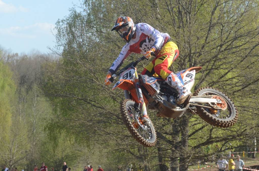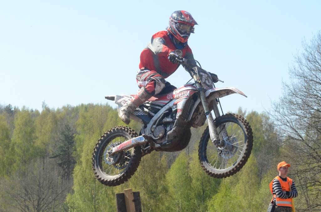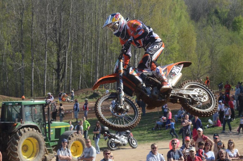 PAPILDINĀTS AR BILDĒM. Svētdien, 27. aprīlī, Misiņkalna mototrasē Aizputē ar Matīsa Karro pārliecinošu uzvaru noslēdzās Latvijas čempionāta motokrosā pirmais posms “MX1” klasē. Skatītājiem par lielu prieku “MX2” klasē otrajā braucienā pārliecinošu uzvaru izcīnīja kalvenieks Pauls Jonass.
