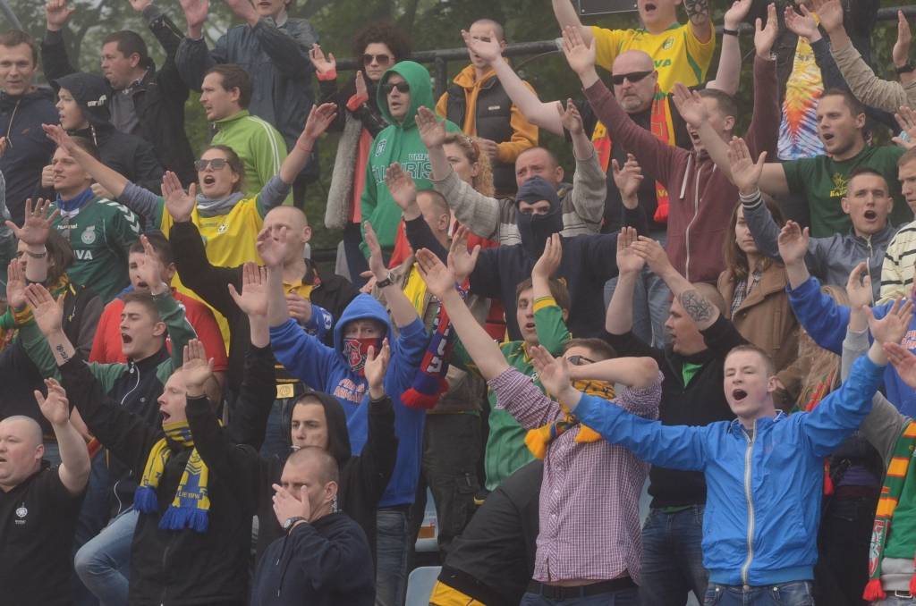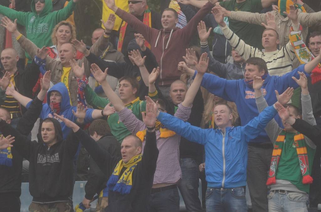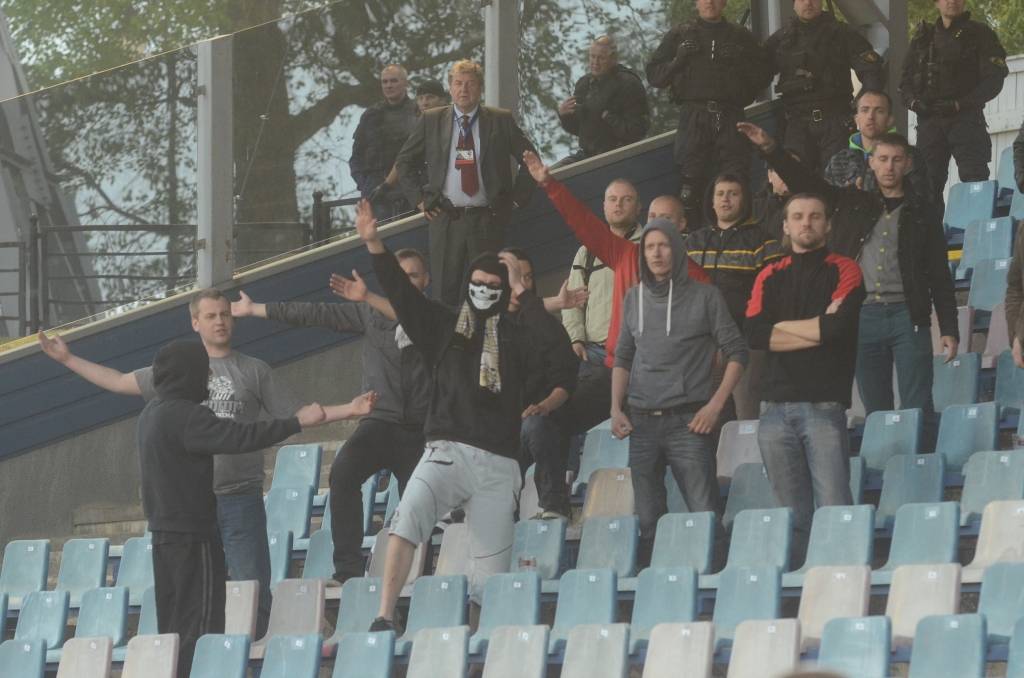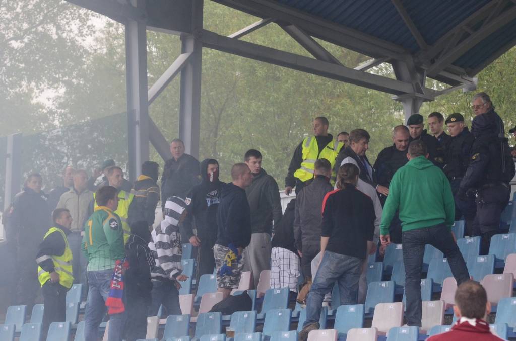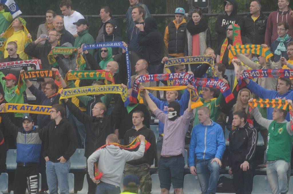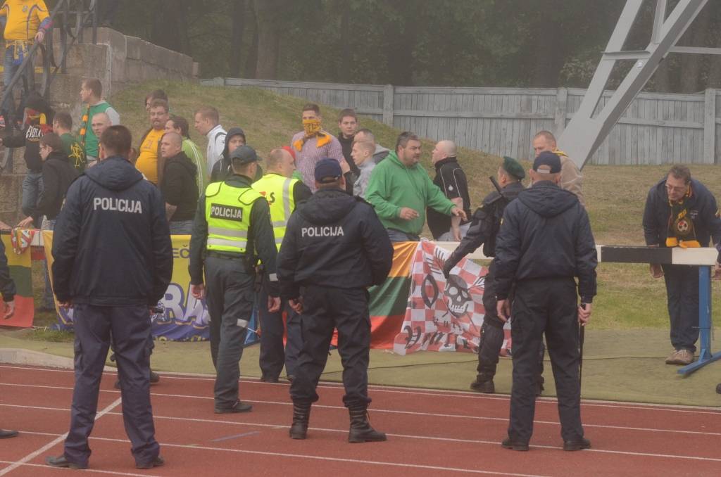 Dažas minūtes vēlāk spēli nācās uz mirkli pārtraukt, jo laukumā izskrēja Lietuvas valstsvienības atbalstītāji, steidzoties uz pretējo tribīni, kur apsargi Latvijas fanus vēlējās apturēt no pirotehnikas izmantošanas.