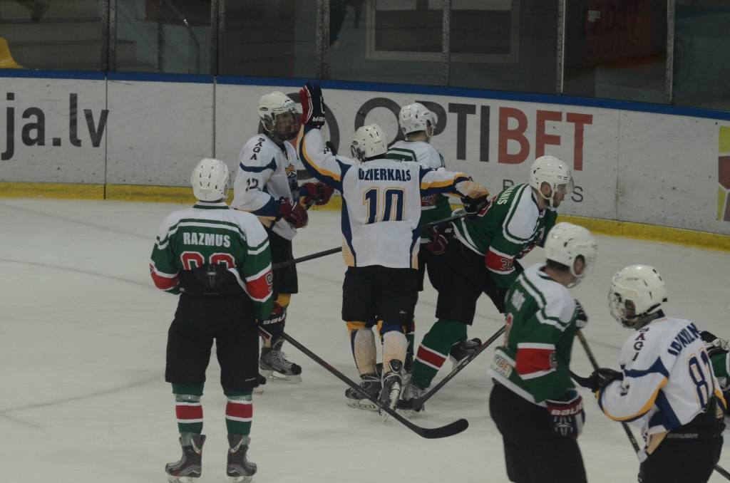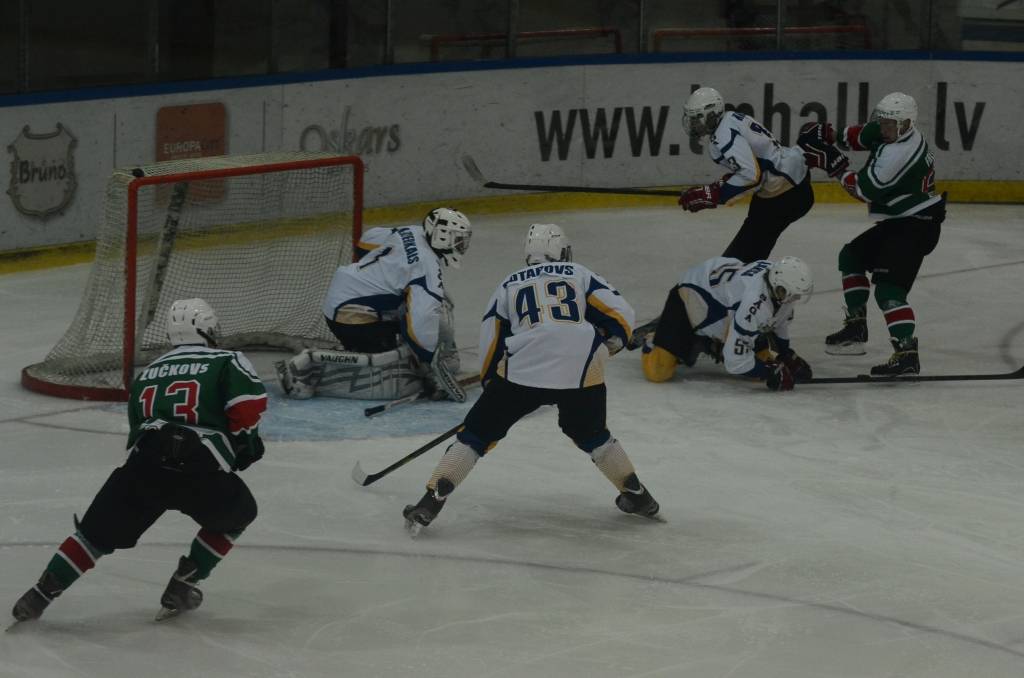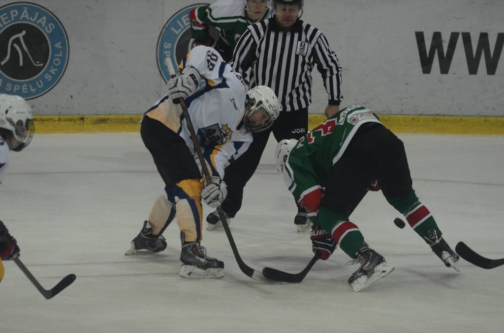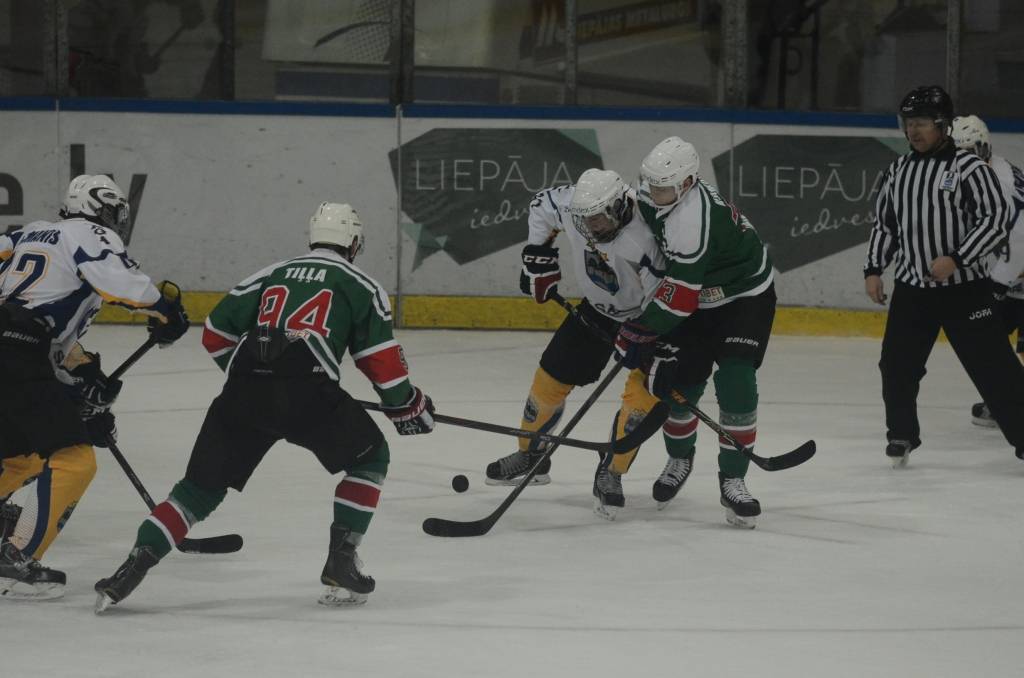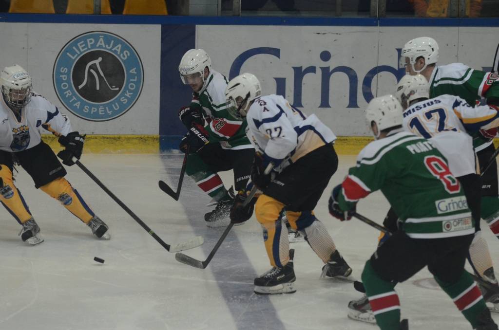 Jau pēc pirmā perioda liepājnieki bija vadībā ar 5:0, katrs pa vieniem vārtiem guva Bruno Zabis, Rodijs Razmus, Valters Freijs, Māris Diļevka un Viktors Jasjonis.