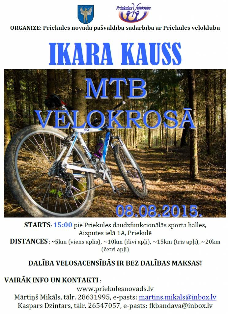 Pulksten 15 velo cienītāji tiek aicināti ņemt dalību Ikara kausā MTB velokrosā. Velokrosa sacensības notiks apļos šķēršļotā apvidū ar dabiskiem un mākslīgiem šķēršļiem. Apļa garums – aptuveni 5 km. Dalībnieku reģistrācija uz vietas no pulksten 13 līdz 14.30 sekretariātā pie Priekules daudzfunkcionālās Sporta halles.