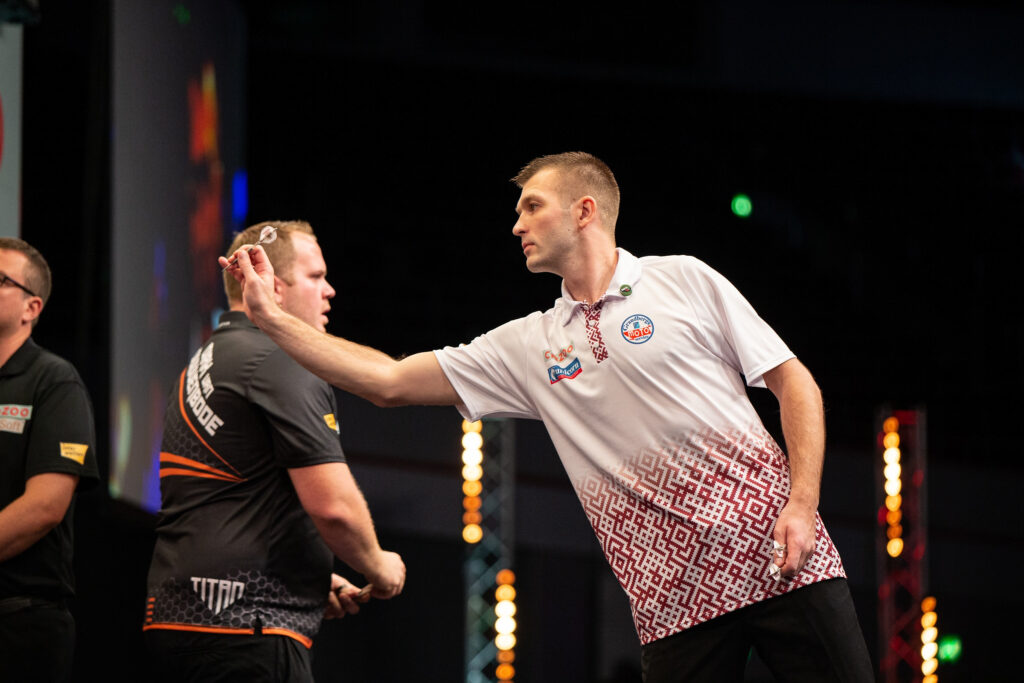 Latvijas duets maču sāka ar breiku, bet nākamajos četros uzvarēja pretinieki. Turklāt otrajā un trešajā legā abi beļģu šautriņu metēji katrs izcēlās ar 180 punktu gājienu.