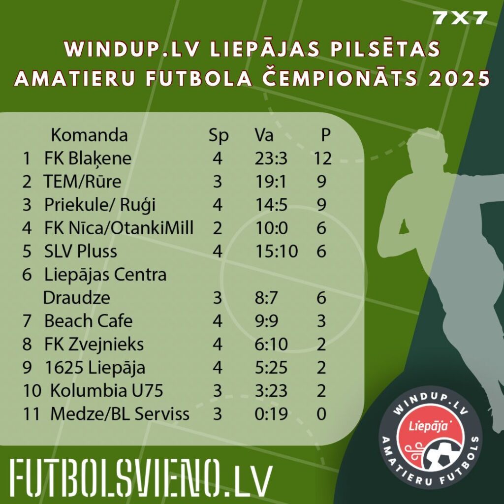 Pie pirmajām uzvarām WindUp.lv Liepājas amatieru futbola čempionātā pēcspēles sitienu sērijās tika gan “Kolumbia U75”, gan “1625 Liepāja”, savukārt bez zaudējumiem performēt turpina kā “TEM/Rūre”, tā arī “Blaķene”. Aizvadītajā nedēļā tabulā divreiz fiksēta līderu maiņa, patlaban spicē – “Blaķene”.