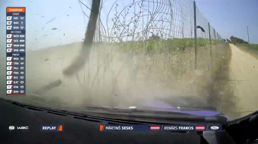 Liepājas rallija ekipāža ar pilotu Mārtiņu Sesku un stūrmani Renāru Franci piektdien rallija čempionāta (WRC) sestā posma – Sardīnijas rallija – otrajā ātrumposmā piedzīvoja avāriju.